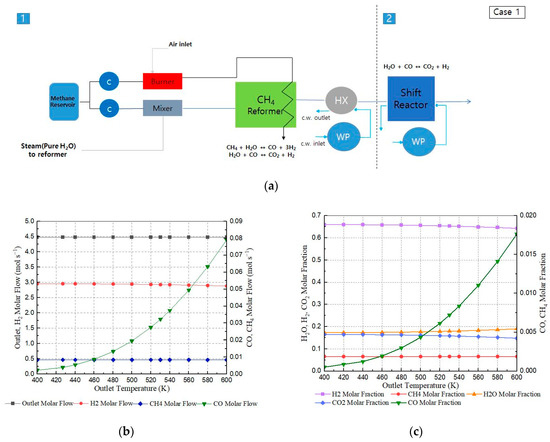 (a) Schematic of methane reforming system for PEMFCs, Graph of (b) molar flow and (c) molar fraction of outlet side (Case 1).