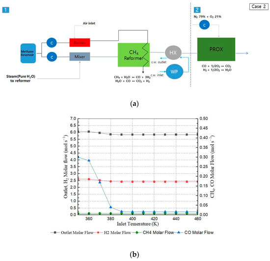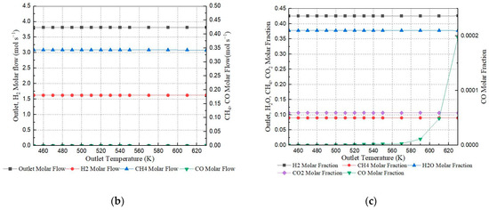 The third case is where a methanation reactor is installed to remove CO through selective CO methanation. Figure 6a shows the schematic of the system in which PROX is applied as a gas post-treatment. Figure 6 also shows the results calculated by passing the methanation reactor through a gas post-treatment. Figure 6b is the molar flow rate, and Figure 6c shows the calculation result for the molar fraction. When comparing the hydrogen flow rate and the molar fraction, it was confirmed by numerical value that the hydrogen yield was significantly lower than that when using WGS or PROX alone. When using WGS or PROX, the hydrogen flow exceeded 2.0 mol s−1, whereas in the case of methanation alone, it did not reach 2.0 mol s−1. In addition to this, even when the operating temperature was increased, the hydrogen yield did not increase significantly, and the molar fraction of CO exceeded 10 ppm when it was 590 K or more, which did not satisfy the standard. Accordingly, the methanation reactor was effective in removing a small amount of CO, and the lower the operating temperature, the lower the molar fraction of CO. If the methanation reactor was used alone, the concentration of CO may have been below the standard, but the sole use of the methanation reactor was not appropriate because the hydrogen consumption rate for removing CO was high, and the hydrogen yield was significantly lower.