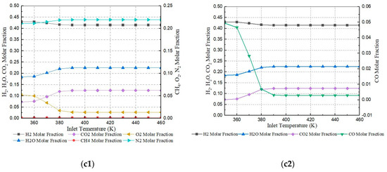 Figure 5b graphically shows the calculation results of the gas flow rate and distribution at the outlet side according to the PROX inlet temperature, to which the selectivity and efficiency values shown in Table 4 were applied. Figure 5(c1,c2) show the temperature dependence of the results. Figure 5a is the value of the molar flow rate, and Figure 5b is the value of the molar fraction. Depending on the value of efficiency, the molar flow rate and the molar fraction of CO processed through PROX are different. The efficiency increased as the temperature increased, but it had a constant efficiency value above 433 K. Calculating the efficiency of 99.9%, assuming PROX with ideal efficiency, the fraction of CO could drop to 0.002, but it did not satisfy 10 ppm. In addition, when PROX was used, the reaction of oxidizing CO and oxidizing hydrogen occurred simultaneously, and the air for oxidizing them was additionally supplied. Therefore, the molar fraction of hydrogen was smaller than when using WGS alone. The molar fraction of CO sharply decreased from 350 K to 390 K at the inlet temperature but exceeded 0.00001. Thus, the gas that had been post-treated with reformed gas only was not suitable for PEMFCs. The PROX used in this calculation was based on a typical degree of efficiency and selectivity, and the degree of oxidation and hydrogen oxidation of CO may vary according to the efficiency and selectivity, depending on the inlet temperature or its own performance.