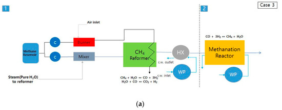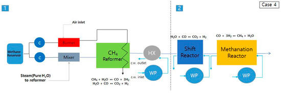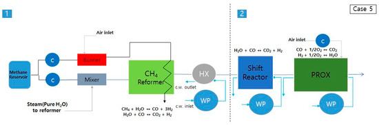 Based on this, we simulated five methane reforming gas post-treatment systems in this study: (1) Case 1—WGS only, (2) Case 2—methanation only, (3) Case 3—PROX only, (4) Case 4—WGS + methanation, (5) Case 5—WGS + PROX. The optimization system was selected by comparing the gas composition ratio, and the molar flow rate was selected by comparing the results before and after the simulation of the post-treatment system.