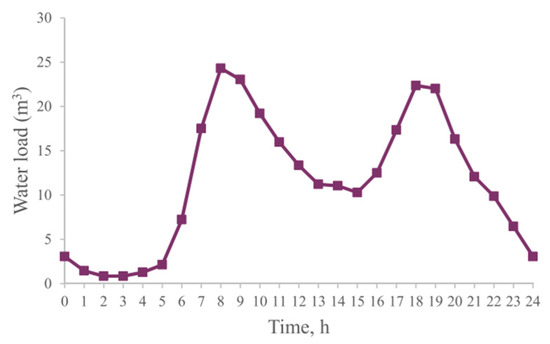 The generated power was sent to the water system to supply and process water in addition to powering the appliances. The hourly water consumption by users, as shown in Figure 1, and the water used by the energy system to produce electricity make up the water network’s demands. Water consumption in the solar PV facility for the illustrative case study was extremely low and was considered to be zero, whereas the biomass system required water, with a water consumption factor of 0.0037 m3/kWh [15]. Additionally, it was projected that 0.9246 kWh of electricity would be utilised for every m3 of provided water load [16].