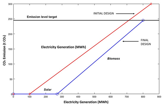 The energy system contributes to the carbon emissions depending on the type of fuel used. For biomass, the carbon emission factor is 0.4032 (t CO2/MWh), as noted by the U.S. Environmental Protection Agency in [20]. The EPPD approach, which was created using the steps outlined by [25], was used to target the quantity of carbon released from the energy network. The network’s energy sources were grouped according to increasing emission factors. The carbon emission from biomass and solar energy sources were obtained on the basis of their carbon emission factors (CFEi) and generation capacity (SEi). Equation (6) can be used to perform the computation in a manner similar to that for the water network. The cumulative power generation and emission levels were used as the horizontal and vertical axes to build the source composite curve (SCC), which incorporates all energy sources. This is depicted in Figure 2. The EPPD graphic shows the 300 t CO2 annual total emissions for the energy network’s initial and final designs.