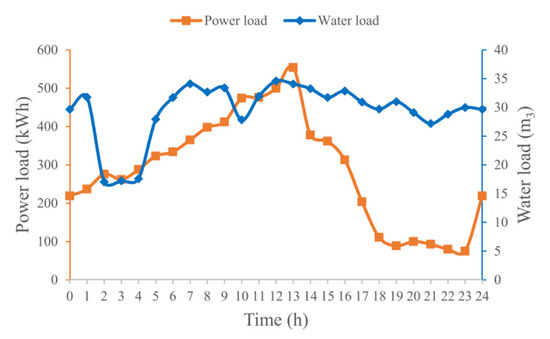 As the case study, a manufacturing facility in Peninsular Malaysia was selected [26]. Figure 3 shows statistics on the plant’s hourly power and water load profiles. Biomass and natural gas generators with respective outputs of 200 kW and 100 kW power the energy system. The system also makes use of a solar system with a 1000 m2 PV area to capture the energy that can be obtained from solar radiation. The solar PV and storage systems’ efficiencies and other details were taken to be the same as in the illustrative case study. In this instance, the water requirement for the solar PV system was not taken into consideration, but the supply of water to the other two power facilities was, i.e., biomass and natural gas at 0.0037 m3/kWh and 0.0044 m3/kWh, respectively [15,16]. The overall results after consideration of losses have been summarized in Table 6.