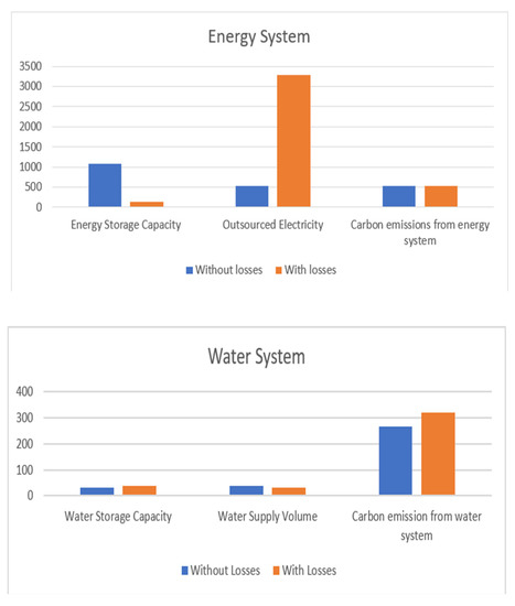 After considering the losses in the power cascade table (PCT) and water cascade table (WCT) for the case study, the results were compared with the initial case study. The results are shown in Table 6. The initial values of the industrial case study were compared with and without losses to find the effect on the energy storage capacity, water supply volume, water storage capacity, outsourced electricity and carbon emissions from both the energy and water systems. It was observed that the electric storage capacity was decreased from 1267 kW to 1212.51 kW, and the outsourced electricity requirement increased from 666 kW to 3027.27 kW, which indicates that after losses consideration in energy system, the amount of electricity required from outside increased more, and the capacity of storage decreased. The water supply volume was increased from 30.67 to 36.951, while the water storage capacity was decreased from 37.89 cubic meters to 32.699, which shows that if losses are considered, the water system requires more water supply volume and hence the water storage capacity decreases. After implementing the design modifications to the energy–water system by increasing the area of solar panels for more renewable energy and reducing the generation from biomass and natural gas power sources, it was observed that the electric storage capacity decreased from 1088 kW to 141.44 kW, and the outsourced energy requirement increased from 526 kW to 3287.5 kW. In the water system, the supply volume increased almost the same as before design modifications, and the water storage capacity also showed almost the same results. Figure 4 shows the comparison chart with and without losses for the case study. The carbon emissions were calculated based on the source’s generation and their emission factors. For the energy system, the power sources remained the same before and after losses, but after design modifications the carbon emissions from energy were reduced from 670 (t CO2/y) to 533 (t CO2/y). In the water system, when the losses were considered, the supply volume increased and hence the carbon emissions also increased by 20%. It was observed that carbon emissions increased from 269 (t CO2/y) to 324 (t CO2/y), but after design modifications it reduced to 321.4 (t CO2/y). The calculated results shows that losses consideration is very important for optimizing the design and modifications in the system. The losses show that the storage capacity of energy decreased by 4%, while outsourced energy increased by 6%. The energy system and water supply volume increased by 20%, and the water storage capacity decreased by 13.7%. The emissions from the energy system remained the same, while from the water system, the emissions increase by 20%.