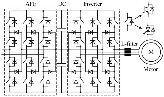 A device called an active front-end (AFE) has several common names found in the scientific and technical literature: PWM boost rectifier, voltage source rectifier, grid-connected voltage source inverter, regenerative rectifier, and bidirectional converter. Semiconductor AFE modules are switched using various pulse-width modulation (PWM) algorithms, which results in a non-sinusoidal output AC voltage and thus makes it challenging to provide electromagnetic compatibility for the consumer and the source. Due to these problems, standards and guidelines [5,6,7,8] have been introduced for the equipment manufacturers and users to rely on. If the feed transformer’s secondary winding inductance is not enough to maintain stable AFE operation, then passive L or LC filters should be additionally installed in existing systems on the grid side. However, the specifications of these filters are close to those of the frequency converter, which increases not only their cost but also the losses and the number of components, deteriorating the system reliability. Active or hybrid filters have not gained popularity in the systems under consideration [9,10,11,12,13].