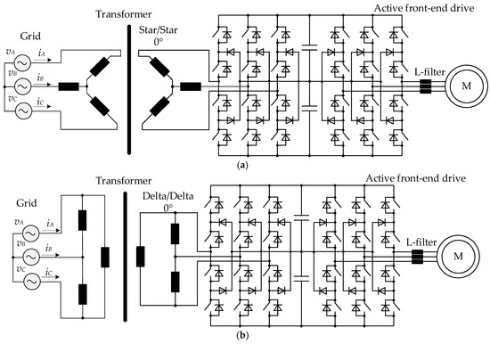 Figure 5 shows 12-pulse circuits, which can also be found in the metallurgical rolling [38,39,40,41]. The circuit in Figure 5a is based on a single multi-winding transformer, the secondary windings of which are connected to two AFEs with a 30° shift. The transformer’s unified magnetic system with additional losses in the magnetically conductive steel due to mixing harmonic components is a significant drawback of this circuit compared to that in Figure 4. Another version of the 12-pulse circuit in Figure 5b is based on two single-winding transformers connected in parallel, the secondary windings of which are connected to two AFEs. This circuit has another significant drawback compared to the previous ones, i.e., higher transformer cost, larger weight, and size parameters.