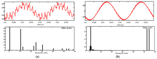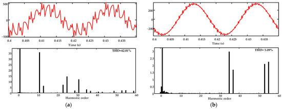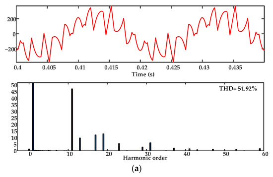 Simulating the current waveform and spectrum in a 12-pulse connection circuit at PPWM with SHE with the 5th, 7th, 11th, and 13th harmonics eliminated: (a) the transformer’s secondary winding; (b) grid.