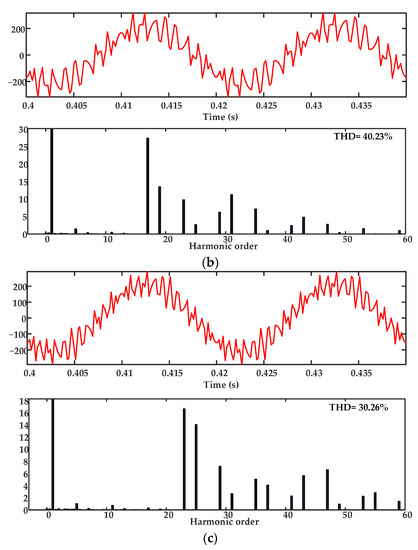 Phase current waveform with harmonic spectrum and THD for 6-pulse connection circuit at PPWM with SHE: (a) 5 and 7; (b) 5, 7, 11, and 13; (c) 5, 7, 11, 13, 17, and 19.