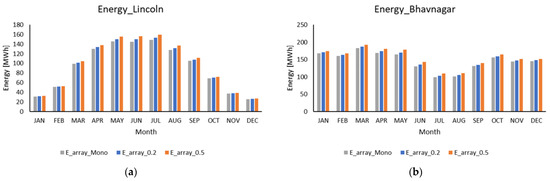 Regardless of the ground surface, the total energy produced in Bhavnagar was 1.5 times more than the energy produced at Lincoln. The energy production decreased during summer at Bhavnagar due to higher turbidity and a higher ambient temperature, which causes reduced PV cell efficiency. The typical temperature at this location was higher during summer, and the overall ambient temperature was around 30 °C. An energy reduction during summer can be observed in Figure 4b, whereas for Lincoln, the energy yield was optimised for the summer (Figure 4a). This can be explained by the total available irradiance at the location. For example, in the UK, the in-plane irradiance was significantly lower during fall and spring (17–50 kWh/m2). However, during summer, the temperature at Lincoln was much lower (11–17 °C) than at Bhavnagar. The irradiance rose, which caused the power output to increase.