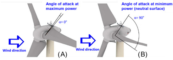 The following figure (Figure 2) shows the two basic angles (positions) of rotation of the blades. Figure 2A shows the normal position during operation. When the wind is fully utilized, the turbine produces the most power. The angle of the turbine blade corresponds to the value α = 0°. The second position can be seen in Figure 2B. In this case, the turbine blades are rotated at an angle α = 90°. It is a neutral position [11]. The turbine rotor does not move or moves only very slowly [12]. This means that even in the case of wind, the turbine power is minimal. In the range of these two angles (positions), the turbine blades can rotate and, according to this rotation, are able to regulate the power according to the requirements of the network.