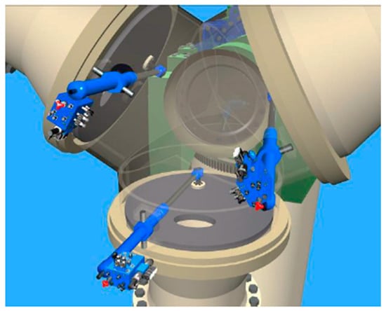 This turning system is a combination of electric and hydraulic systems. In this case, the change of the angle of attack is ensured by the electrical system, while the safety elements, which prevent damage to the blades and the rotor, are ensured by the hydraulic system [24]. In this case, the risk of hydraulic fluid leakage is rapidly reduced, as the rotation of the blades is performed by an electric motor. This will reduce energy costs [22]. The great advantage of this hybrid system is that operators do not have to worry about batteries, and in the event of their failure, the turbine components are not damaged.