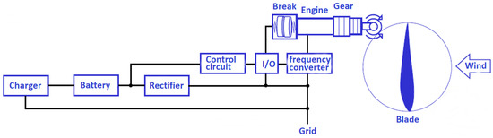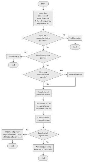 Nacelle rotation. If the sensors sensing the rotation of the nacelle detect an incorrect rotation in the wind direction from the weather measuring device, the electric motors of the deflection device are instructed by the controller (nacelle rotation control unit) to rotate the nacelle correctly in the wind direction [33]. This step is not possible before the question “Need to regulate power?”, because if the turbine power did not need to be regulated, but the rotation of the nacelle against the wind was a little off, the power would need to be regulated automatically after the rotation of the nacelle against the wind.