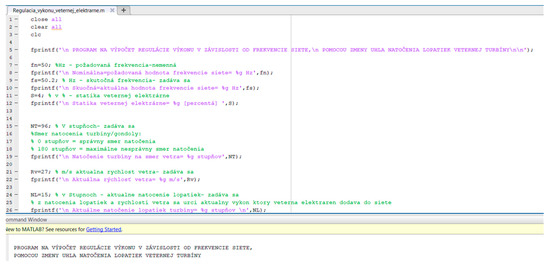 To get a correct idea of how the regulation of the wind turbine power by turning the angle of attack should work in principle, a program was prepared. The program was created in the MATLAB application (Figure 8). This program can also be created in other applications.