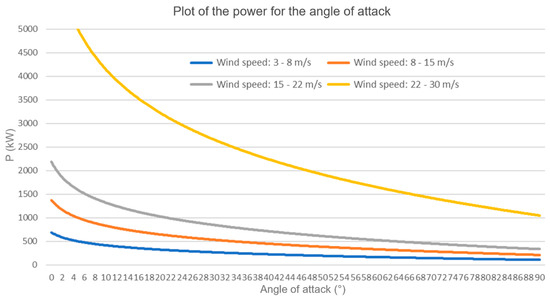 Calculation of produced power. If the direction of rotation of the nacelle is correct for the wind direction, the control unit can calculate the actual power produced by the turbine. The power produced by the turbine can be determined from the power characteristics. The power characteristic is the dependence of the produced power on the angle of attack at a certain wind speed. These performance characteristics are determined by each wind power company in its own laboratories or in practice. Experiments can be carried out in a wind tunnel on a reduced copy or through simulation in special computer programs. Performance characteristics are the know-how of every company and are not publicly available [28,34]. The wind turbine rotor blades can change their angle of rotation from 0° to 90°. Marking the maximum and minimum of performance is a personal matter. The maximum rotation and maximum power can be 0° when rotating. The turbine reaches the minimum rotation and zero power when rotating the blades at an angle of 90°. But it can also be the other way around. It depends on the designation of the starting point. Theoretically, the performance characteristic can be linear, but in practice, the performance characteristic is likely to be nonlinear. [9].