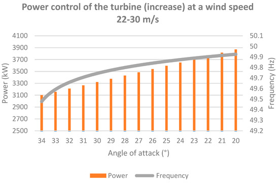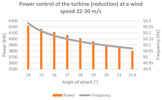 In Figure 12, the wind turbine blade rotation system can be observed in operation. Thanks to its work, it is possible to regulate the power of the wind farm according to the requirements of the network. The axes of the graphic dependence are marked in this case in the same way as in the previous example. Also, the power and frequency designations are shown in the graph in the same colors. At the current wind speed of 27 m/s, the turbine produces a power of 4777.7 kW. The angle of attack is, in this case, equal to 4°. In the current situation in the network, when the frequency is 49.8 Hz, it is necessary to increase this power by the required value. This value is 477.77 kW in this case. Performance increases due to insufficient network frequency. It is necessary for the wind power plant to regulate its power and for the value of the frequency to increase by 0.2 Hz to 50 Hz. The power plant output must be increased until the frequency is equal to 50 Hz. In this case, a situation arises where it is not possible to completely regulate the power plant’s output.
