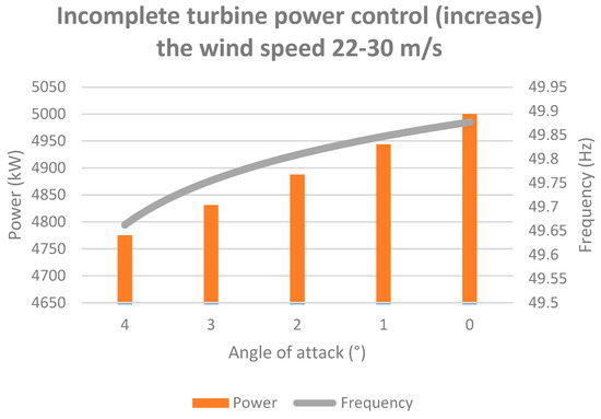 From the evaluation of the calculated values, it can be stated that the sum of the value of the current produced power and the necessary change of power to regulate the network frequency (4777.7 kW + 477.77 kW = 5255.47 kW) is greater than the maximum possible produced power of 5000 kW. It follows that the rotor blades would need to be rotated by more than 4°, which is also more than the extreme limit of rotation. In this case, the power control stops at a maximum value of 5000 kW, when the angle of attack is 0°. The regulated power has a value of only 222.3 kW. It is not possible to adjust the mains frequency to the prescribed value of 50 Hz. Wind power regulation is incomplete. The graph of incomplete regulation is shown in Figure 12. At this point, it is necessary that several wind power plants are interconnected, which would communicate with each other and be able to regulate the remaining power in the network.