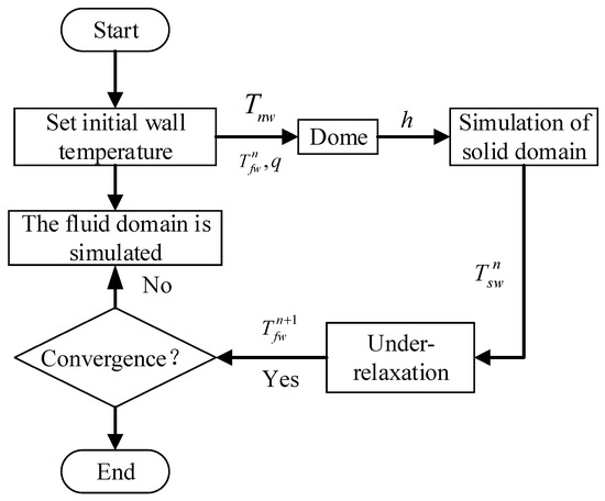 1. The coupling wall temperature of the fluid domain is set, and calculation is performed on the fluid domain (external flow field). Then, the heat flux () and near wall temperature () of the coupling surface in the fluid domain are obtained. The convective heat transfer coefficient () of the coupling surface is calculated using the following equation: