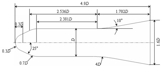 We adopted the classical HB-2 hypersonic aircraft model [17] of the Advisory Group for Aerospace Research and Development (AGARD) to analyze the aerodynamic and thermal characteristics of the hypersonic flow field. The commercial software ANSYS Fluent was selected to perform the simulations. To validate the accuracy of the aerodynamic and thermal simulation of the hypersonic flow field, the numerical simulation results with the wind tunnel test data [18] obtained from AGARD and Japan Aerospace Exploration Agency (JAXA) were compared. The inflow parameters of the JAXA hypersonic wind tunnel test are presented in Table 1. The JAXA wind tunnel test model is a standard HB-2 model consisting of a spherical dome, a cone segment, a cylinder segment, and a tail expansion segment. The circular cross-section diameter of the JAXA wind tunnel test model is D = 100 mm, and the other parameters are shown in Figure 2. We focus on the aero-thermal analysis of hypersonic flight at zero attack angle. Because the HB-2 model is axisymmetric, the hypersonic flow outside the HB-2 model can be taken as symmetrical flow. To improve computational efficiency, a two-dimensional (2D) model is used in the numerical simulation, and only half of its 2D plane model is drawn. The grid division and boundary conditions are illustrated in Figure 3, and Figure 4 shows an enlarged view of the HB-2 dome near-wall grid division.
