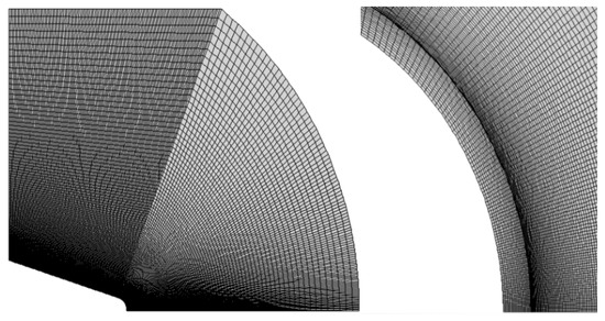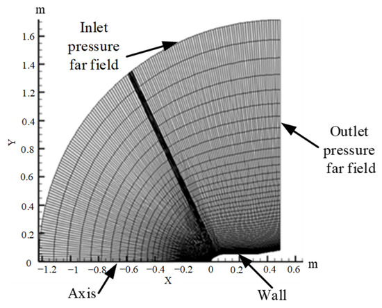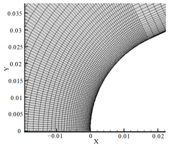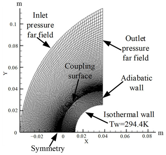 According to the abovementioned wind tunnel test settings and test data, a 2D model for hypersonic circular pipe flow is established. Because the tube is symmetrical, we mainly focus on the aerodynamic heat transfer characteristics of the windward side of the circular tube. To improve the calculation efficiency, only a quarter of the model grid of the circular tube is constructed, and the calculation grid and boundary conditions are set, as shown in Figure 8.