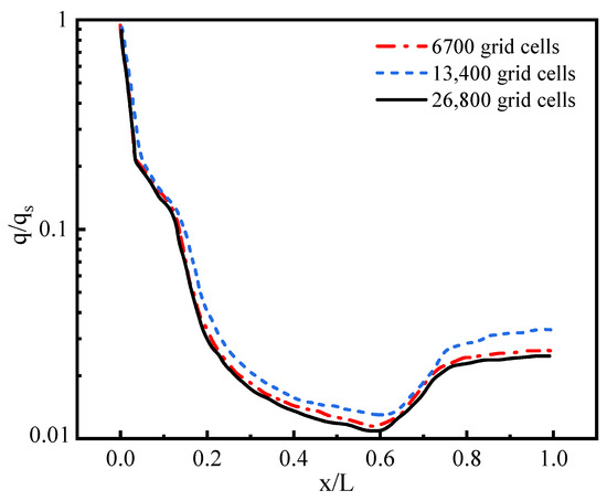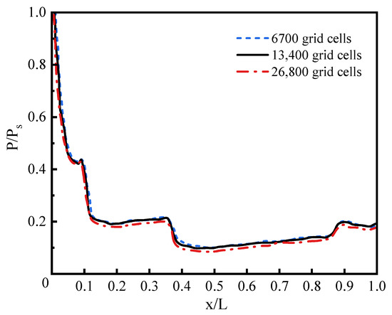 The results for the regional meshing of the hypersonic flow field are validated. As shown in Figure 5 and Figure 6, the surface pressure and heat flux of the HB-2 model with different grid numbers are distributed along the axial direction. The surface pressure P and the axial position X of the HB-2 model are treated as dimensionless parameters with the stagnation pressure Ps and the total axial length L of the model as reference values. As shown in Figure 5, there is no obvious difference for the results of three grids, indicating that the numerical calculation of pressure distribution of the hypersonic external flow field by these grids is independent. In addition, as depicted in Figure 6, there is no obvious difference between the calculation results for the axial heat flux distribution for 13,400 grid cells and 26,800 grid cells. However, the heat flux calculation results for 6700 grid cells are different from those of the other two grids. Therefore, the case with 13,400 grid cells has the characteristics of grid independence in calculating the heat flux of the hypersonic flow field. Thus, considering the computational efficiency, a 13,400 grid cells-mesh model is used to simulate the aerodynamic heat of the hypersonic external flow field.