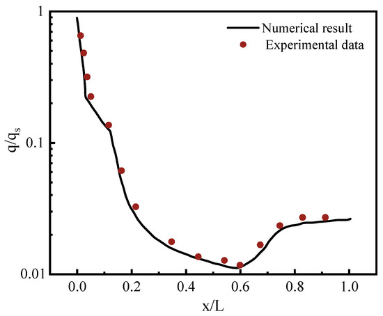 Figure 7 shows the numerical simulation results and JAXA test results in the hypersonic wind tunnel for the distribution of heat flux along the axial wall at Mach 9.6. The simulation results are dimensionless, and the coordinate is exponentially displayed to highlight the heat flow distribution in each position of the model for comparing the heat flow of each position with the experimental results. The comparison of JAXA wind tunnel test data and numerical simulation results reveals that they are consistent, thus showing the effectiveness of the proposed numerical method.