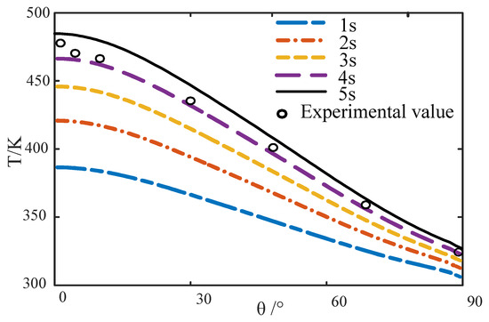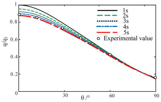 Figure 9 shows the distribution of heat flux density on the wall of a circular pipe in the process of unsteady fluid–thermal coupling calculation. At this time, the wall temperature is high and changes with time. The coordinate in the figure shows the ratio of the heat flux at each time point to the heat flux at the stagnation point at 1 s. The abscissa is the angle between the wall position and the central axis. As shown in Figure 9, the heat flux of the coupling wall shows good agreement with the experimental value. Figure 10 shows the temperature change of the outer wall of the round pipe with time. The temperature distribution on the wall of the circular pipe at 4 s was consistent with the wind tunnel test results [20]. Thus, the proposed numerical method is accurate in simulating the fluid–thermal coupling problem of a hypersonic circular pipe.