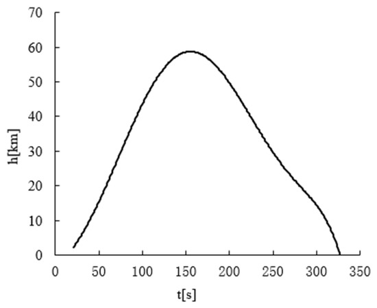 We have studied the temperature and pressure of the aircraft optical dome during the whole flight. The flight time is from 20 s to 330 s. To simplify the analysis, we assume that the attack angle is 0°. Figure 13 shows the change of aircraft flight altitude with time. The maximum flight altitude is approximately 60 km, and the aircraft enters the reentry section immediately after reaching the maximum altitude at about 160 s.