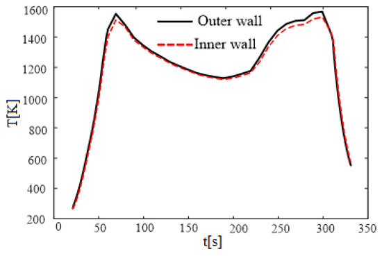 Figure 15 shows the changes in the average temperature of the inner and outer walls of the optical dome with time. The wall temperature distribution exhibits an “M” shape, with two high-temperature cusps and one low-temperature cusp. At 70 s, the average temperature reaches the first peak of 1565 K. At 290 s, the average temperature reaches the second peak of 1560 K. There is a low-temperature cusp between the two peaks at 190 s, when the average temperature of the optical dome is 1130 K. The temperature increases rapidly before 70 s and reaches 1550 K at around 50 s. From 70 s to 290 s, the temperature firstly decreases and then increases, but the total change is within 450 K. It can be seen from Figure 13 that the aircraft experiences lift-off and reentry processes during this period. From 290 s to the end, the temperature decreases rapidly, and the change rate of temperature is similar to that at the beginning of the flight.