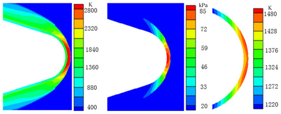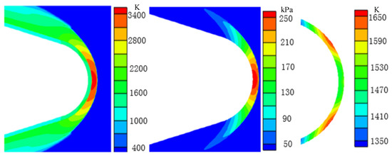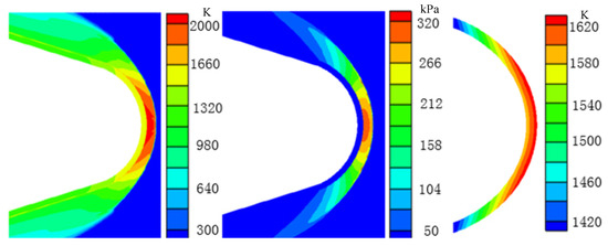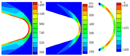 Figure 25 and Figure 26 show the results of the temperature field, the pressure of the external flow field, and the temperature of the optical dome structure at 239 s and 290 s, respectively. At 239 s, the flight altitude decreases to around 33 km, and the flight velocity decreases slightly compared with the second period. The temperature of the external flow field near the optical dome is above 2800 K, and the maximum temperature is around 3000 K. As the optical dome has cooled to below 1200 K in the second period, the average temperature difference between the optical dome structure and the external flow field near the optical dome increases to nearly 2000 K. This temperature difference increases the intensity of aerodynamic heating and the balance between aerodynamic heating and radiation heat dissipation no longer exists. The temperature outside the optical dome increases, and the heat is transferred inside. The maximum temperature of the optical dome structure increases to over 1480 K at this moment, and the temperature of the optical dome edge and inner wall surface increases to over 1220 K. It can be seen from the pressure of the external flow field that the pressure near the back cover wall of the shock wave increases to 85 kPa. This is mainly due to the decrease in flight altitude and denser air than that at 190 s; thus, the inflow pressure increases, which is finally reflected in the increase in the pressure on the optical dome wall.