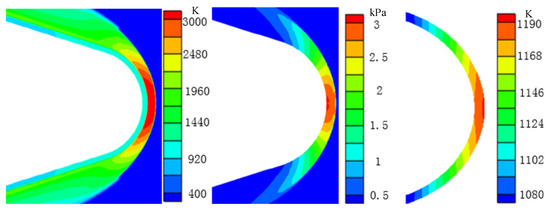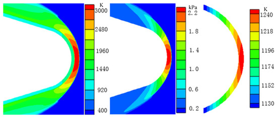 Figure 23 shows the results at 149 s, when the flight altitude is around 59 km, which is close to the maximum altitude of 60 km. The maximum temperature of the external flow field at this moment is approximately 3000 K, while the maximum wall pressure is only 2.2 kPa. The maximum temperature of the optical dome structure is approximately 1240 K. Compared with the results at 109 s, temperature of the external flow field, pressure of the external flow field, and internal temperature of the optical dome structure decrease. The reason for the decrease is similar to the analysis at 109 s. Due to the further increase of the flight altitude, the aircraft is in an atmospheric environment with low temperature, low pressure, and low density (thin air). The aerodynamic heating effect continues to weaken, while the radiation heat dissipation continues to strengthen due to the fourth square correlation with the structure temperature, resulting in the decrease of the optical dome structure temperature. The pressure on the optical dome wall remains extremely low due to the low-pressure environment.