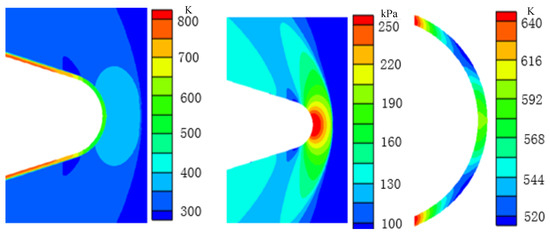 Figure 28 shows the results of the final moment of the whole flight when the flight altitude is close to the ground. At this moment, due to the continuous decrease in flight velocity, the shock angle of the detached shock wave on the nose of the aircraft is very large, and the parameters before and after the shock wave change only slightly. The temperature of the optical dome structure is higher than the maximum temperature of the flow field, and heat is continuously dissipated through convection and radiation. The maximum temperature of the optical dome structure is approximately 640 K. The temperature of the conical section behind the optical dome is higher than that of the optical dome. Due to the internal heat conduction of the aircraft structure, the temperature gradient between the titanium-alloy conical section and the sapphire optical dome leads to heat transfer from the conical section to the optical dome; thus, the temperature at the position where the titanium-alloy conical section is connected to the optical dome is higher than that at other positions of the optical dome.