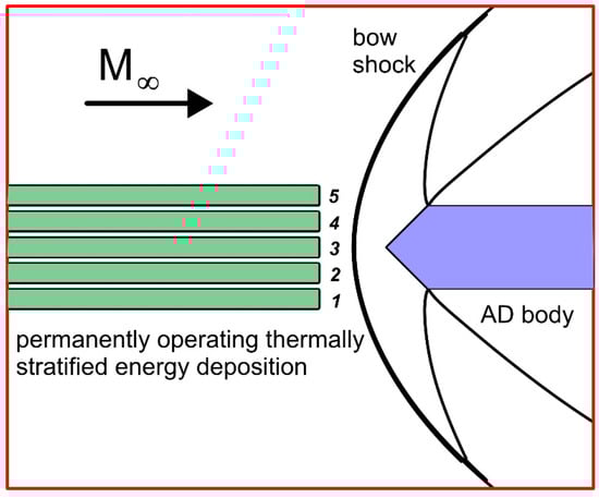 The constantly acting, thermally stratified energy deposition is modelled by a set of rarefied gas layers of the same width, located in front of the bow shock wave (see Figure 1). The gaps between the layers were set equal to half the layer width. Inside the layers (indicated by the index j), gas density is specified to be reduced, ρj = αjρ∞, αj < 1, j = 1 ÷ Nes; Nes is a number of layers in the energy source (in these calculations, Nes = 5). Pressure and velocity in the layers are set equal to their freestream values: pj = p∞, uj = u∞, vj = 0. Therefore, temperature inside the layers is increased compared to its freestream value, Tj = αj−1T∞. Thus, a thermally stratified energy source is determined by a set of the parameters of the gas rarefaction {αj} = (α1, α2, … αNes) in its layers. In the calculations, such an energy source is obtained via the boundary condition at the entrance boundary, at x = 0, where the parameters of the heated layers are set along with the parameters of the oncoming flow.