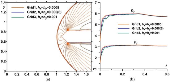 Analysis of the grid convergence on three different grids: (a) density fields (isochores, superposed); (b) dynamics of the pressure pt and density ρt at the top of the body.