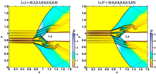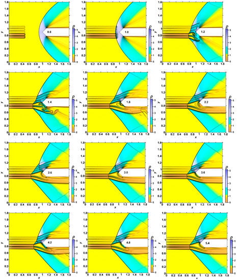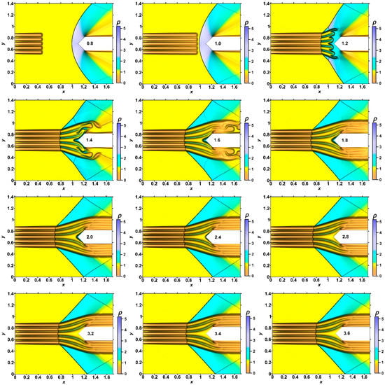 The dynamics of the density fields during the interaction of a thermally stratified energy source with a supersonic flow past a body “a plate pointed by a wedge” is presented in Figure 3 (the time instances are shown in the images). Here, {αj} = (0.3,0.3,0.3,0.3,0.3). First, the source approaches the steady bow shock wave (images for t = 0.8 and t = 1.0) and begins to interact with it. As a result of the interaction of the bow shock wave with the boundaries of thermal layers (which are contact discontinuities), the multiple Richtmyer–Meshkov instabilities develop, accompanied by the formation of vortex structures [39,44] (t = 1.2). These vortex structures determine a new multi-vortex mechanism of action on a streamlined body (t = 1.4–1.6) (see [44], where this mechanism is described for a time-limited stratified impulse).