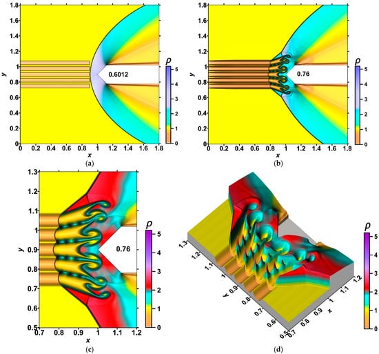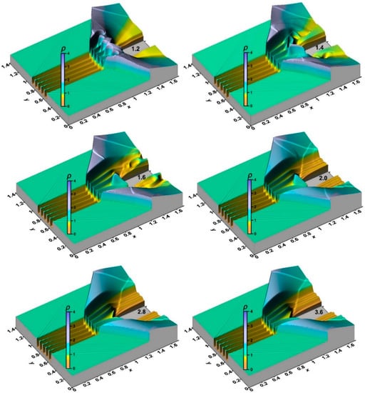 The corresponding dynamics of the density fields in a surface view are shown in Figure 4. It can be seen that the interaction is accompanied by almost complete destruction of the front of the bow shock wave in the zone of layers of the stratified energy source. In addition, sharp peaks are visible, indicating the occurrence of Richtmyer–Meshkov instabilities.