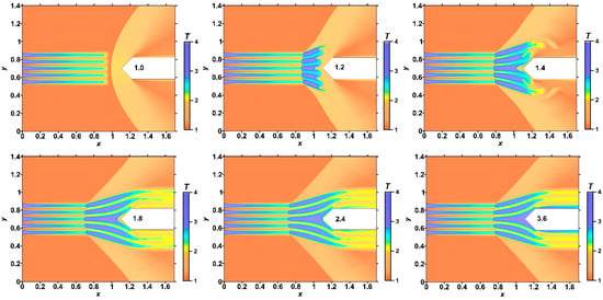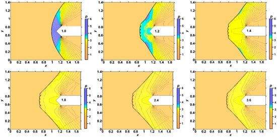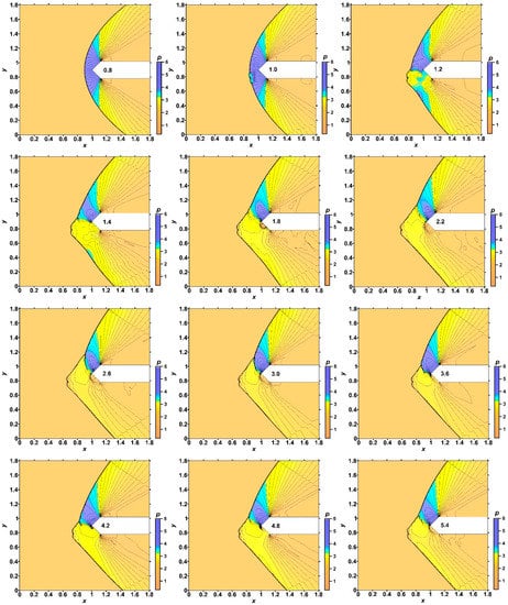 The according dynamics of pressure, temperature fields and the fields of a local Mach number are presented in Figure 5, Figure 6 and Figure 7. A significant change in the steady flow mode is clearly seen from the images of the pressure fields shown in Figure 5. One can see that, under the action of a stratified energy source, the pressure in the shock layer, as a whole, decreases. This is accompanied by a change in the shape of the front of the bow shock wave: in the region of heated layers, the wave front becomes wavy, and at the periphery, the bending of the front of the bow shock wave changes to the opposite. Note that since, by construction, the boundaries of the source layers are contact discontinuities, the source layers are not visible on the pressure field images.