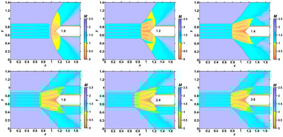 The temperature fields shown in Figure 6 are consistent with the density fields, and the resulting steady flow is characterized by a layered temperature structure. The fields of the local Mach number also become layered in the new steady flow mode (Figure 7). In this case, the shape of the subsonic region between the body and the bow shock wave changes. It can also be seen that in the new steady flow mode, the sound line emanating from the corner point of the body is wavy, reflecting the layered structure of the flow in the shock layer.
