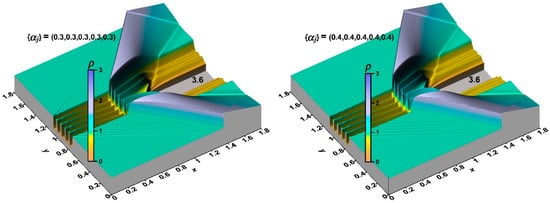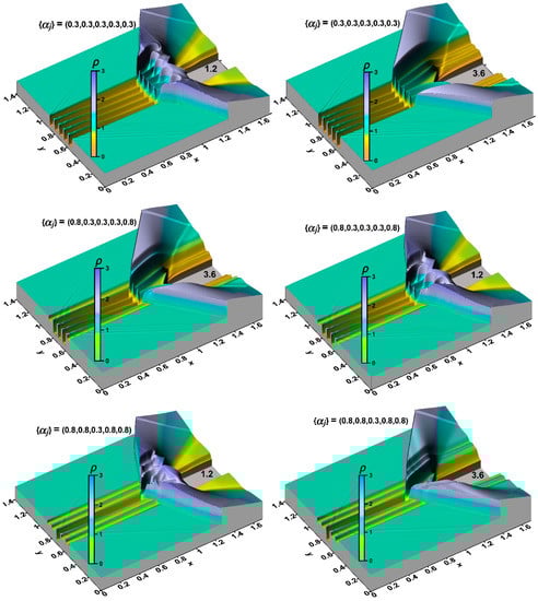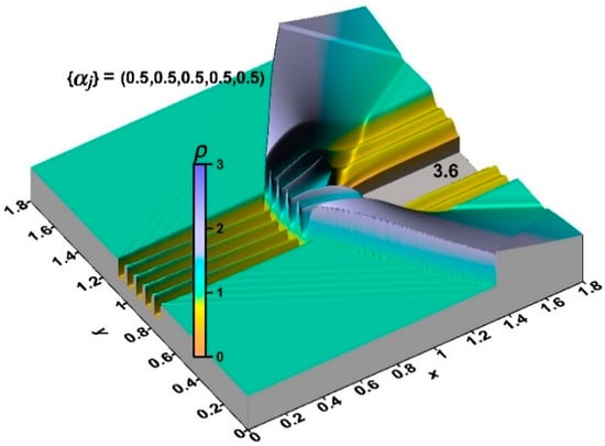 In Figure 8, the surface view of the density fields for different symmetrical sets {αj} = (0.3,0.3,0.3,0.3,0.3), {αj} = (0.4,0.4,0.4,0.4,0.4), and {αj} = (0.5,0.5,0.5,0.5,0.5) in the thermally stratified energy source in the new steady flow mode established is presented. Note that we define a steady flow mode as a flow mode where the pressure and density at the top do not change. It can be seen that the sharp peaks accompanying the development of the Richtmyer–Meshkov instabilities remain in the steady flow mode established under the action of a stratified energy source. The magnitudes of the picks are greater for smaller αj (greater temperature) in the layers of the energy source.