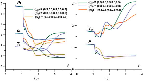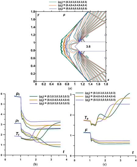 Figure 9 illustrates the flow analysis for different sets {αj} with equal values of αj (and values of temperature) in the source layers. In Figure 9a, the pressure fields are presented for the steady flow mode. Here, the front of the bow shock is wavy reflecting the stratification of the energy source. The bow shock wave is located more far from the body for the smaller αj (greater temperatures) in the layers (green curve), which, however, was expected. In addition, it can be seen that the more the angle of inclination of the bow shock wave changes, the smaller the values αj in the layers. The dynamics of pressure, density, and temperature at the top of the body as well as those of the average front surface temperature Ta and the drag force F during the steady flow establishing for different sets {αj} with equal values αj are presented in Figure 9b,c. Here,