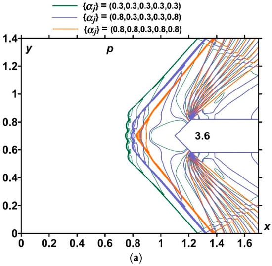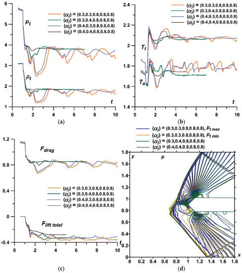 The corresponding pressure fields in isolines are shown in Figure 17d. In addition, the pressure fields are presented for {αj} = (0.3,0.3,0.8,0.8,0.8) for the time instants of maximum and minimum values of pressure at the top (blue and orange curves, respectively). It can be seen that the position of the bow shock wave is closer to the position at the moment of t corresponding to the maximum pressure at the top. At the same time, the deflection angle of the rectilinear bow shock wave at the periphery (green curve) exceeds the angles established in the oscillatory mode (orange and blue curves).