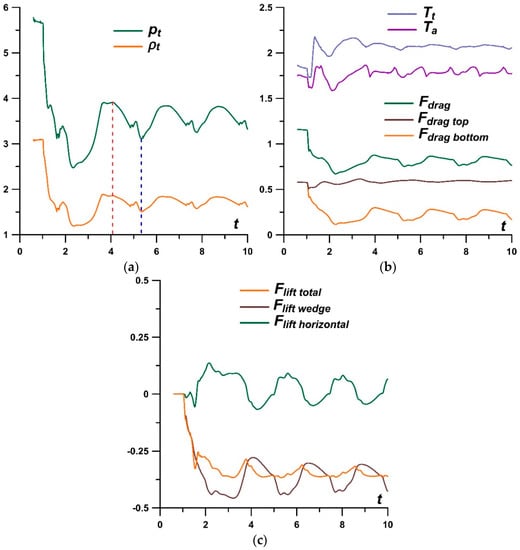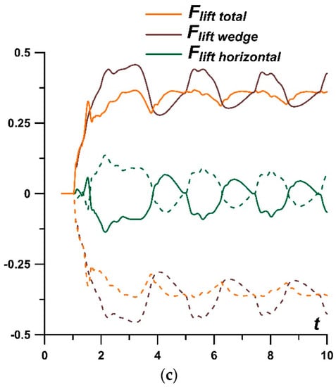 Dynamics of flow characteristics for the reverse set {αj}R = (0.8,0.8,0.8,0.3,0.3) are presented in Figure 19. Dynamics of pressure, density, and temperature at the top of the body are presented in Figure 19a,b (green, orange and blue curves). One can see that the dynamic of these parameters is quite the same as for {αj} = (0.3,0.3,0.8,0.8,0.8) (compare with Figure 14a,b). The same can be said about the dynamics of the average temperature of the frontal surface and the drag force Fdrag (purple and green curves in Figure 19b). However, forces Fdragtop and Fdragbottom are exactly opposite in magnitude (compare Figure 19b and Figure 14b, brown and orange curves). The dynamics of lift forces for {αj}R are shown in Figure 19c. For comparison, the dashed lines show the dynamics of lift forces for {αj}. It can be seen that a stratified source with a reverse set {αj}R produces equal, in absolute value, and reversely directed lift forces acting on the body.