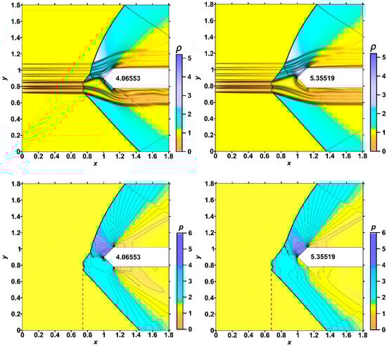 Note, however, that the entire flow oscillates along with the bow shock wave. Indeed, we can see this in Figure 15, where the fields of density, pressure, temperature, and local Mach number are presented for {αj} = (0.3,0.3,0.8,0.8,0.8) for the time instant of maximum value of pressure at the top (left row of images) and for the time instant of minimum value of pressure at the top (right row of images). When the pressure at the top is maximal, the dimensions of the triple configuration are the smallest, the front of the bow shock wave is at the closest distance from the body, and the separation bubble is just emerging; separation is almost absent, and the flow near the lower boundary is weakly subsonic (left row of images). When the pressure at the top is minimal, the dimensions of the triple configuration are the largest, the standoff distance of the bow shock wave from the body is maximal, the flow is separated with the formation of the separation bubble, and the flow is strongly subsonic near the lower boundary (right row of images). Therefore, it should be underlined that the standoff distance of the bow shock wave from the body is pulsing, too.