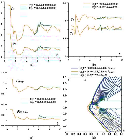 where Tk and pk are the temperature and pressure values at the k-point on the front surface of the body, N is a number of grid points on the front surface, and y0 is the y-coordinate of the axis of symmetry of the body. It can be seen that in the steady flow mode, the pressure and density at the top of the body and the drag force of the front surface are lower for sets {αj} with smaller αj (green curves).