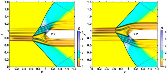 It should be noted that in this work, symmetrical and asymmetric vortex structures (mushroom structures) initiated by the Richtmyer–Meshkov instability are not clearly visible (Figure 3, Figure 6, Figure 12, and Figure 18; t = 1.2, 1.4). This is due to the fact that since the source is set on the left boundary (x = 0) and moves towards the bow shock wave for some time, the boundaries of the initial layers have time to undergo the dissipation due to the action of physical viscosity and thermal conductivity before interaction with the bow shock (as would happen in a real situation when using such an energy source). Therefore, the boundaries of the layers (which are contact discontinuities in the inviscid approach) are somewhat smeared, which contributes to the weakening of the vortices in the vortex structures emerging as the result of the interaction of the layers with the bow shock wave.