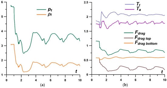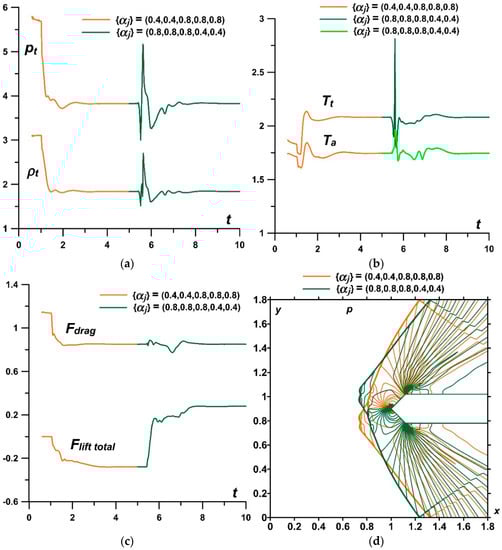 Let the parameters of the stratified source be set as follows: {αj} = {αj}1 = (0.3,0.3,0.8,0.8,0.8) for t < 5.4 and {αj} = {αj}2 = (0.4,0.4,0.8,0.8,0.8) for t > 5.4. The dynamics of pressure, density and temperature at the top of the body is presented in Figure 17a,b, along with of the average front surface temperature, drag forces and lift forces (Figure 17b,c). It can be seen that when replacing at t = 5.4 the set of values {αj}1 in the stratified source with the set {αj}2, the flow after several oscillations comes to a steady state (green curves). In this case, in the new steady flow mode, pressure, density, and temperature at the top of the body as well as the drag force of the front surface are set at the maximum level of these parameters in the previous oscillatory mode, and the average surface temperature is set at the minimum values. At the same time, the absolute value of the total lift force decreases.