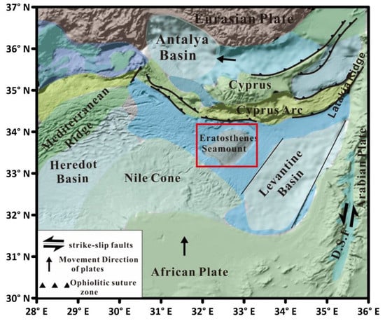 The Eratosthenes Seamount is situated north of the Nile Cone and south of Cyprus and is characterized by a single huge crest nearly 790 m beneath the sea level [20]. As one of the most noticeable bathymetric characteristics in the Mediterranean, the Eratosthenes Seamount is an excellent instance of the start of a collision of a subduction zone with the continental crust, which is joined to the Cyprus continental crust shown in Figure 1. The tectonic evolution of the Eratosthenes Seamount is related to the North African continental margin from the early Mesozoic, according to geophysical and geological studies [21]. The seamount was in a shallow-marine sedimentary setting in the Early Cretaceous, then deactivated to bathyal depths in the Late Cretaceous. Then, in the mid Pliocene–Pleistocene time, the Eratosthenes Seamount was pushed underneath Cyprus due to the collision of the Eurasian Plate and the African Plate [21]. At the time of the Cenozoic, Eratosthenes was moved closer to the Cyprus section of the dynamic edge, and subduction of the oceanic crust (between the African and Eurasian plates) changed to impact [22]. Major structural elements of the Eastern Mediterranean are shown by seismic refraction information [23]. The upper part of the seamount contains deep and shallow water carbonates that belong to the early time of the Cretaceous with tectonic uplift (roughly 1 km). It appears to be the same as the carbonate depositions on the Levant land margin in the east. The neotectonic evolution of the structural features is related to the uplift and emplacement of Troodos Ophiolite in Cyprus [24].
