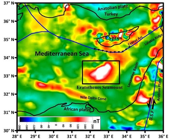 - Ben-Avraham, Z.; Shoham, Y.; Ginzburg, A. Magnetic Anomalies in the Eastern Mediterranean and the Tectonic Setting of the Eratosthenes Seamount. Geophys. J. R. Astron. Soc. 1976, 45, 105–123. [Google Scholar] [CrossRef]