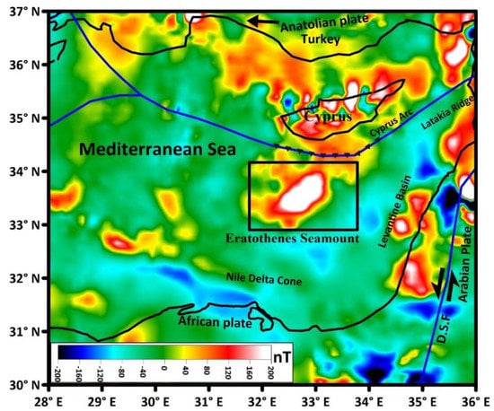 Magnetic data covering the investigated area was taken from the global Earth Magnetic Anomaly Grid (EMAG2) with 2 arc min resolution, a height of 4 km over the geoid [50]. The data was converted from geographic coordinates to Universal Transverse Mercator (UTM) projection coordinates with a spacing of 5 km. Figure 2 shows the magnetic anomaly map of the Eratosthenes Seamount, while Figure 3 represents the reduction of the magnetic data to the pole (RTP) in order to eliminate the deflection resulting from the magnetic field of the Earth [36].