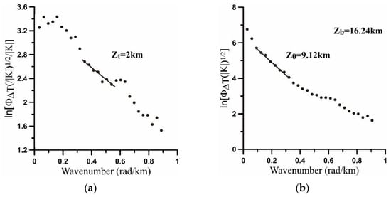 Average power spectrum scheme for CPD estimated in the study area beneath the central part of the Eratosthenes Seamount: (a) top depth in the study area; (b) centroid depth in the study area.