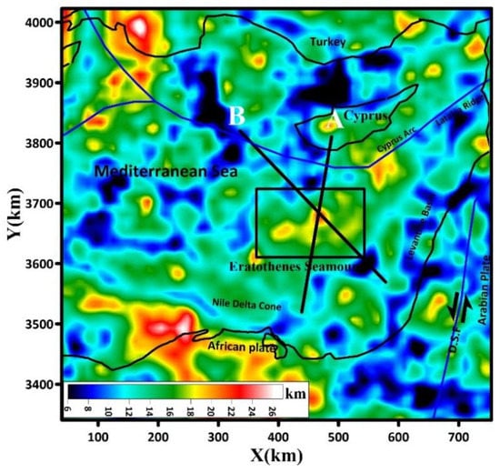 From the map in Figure 5, two cross-sections were taken along the NE-SW axis, shown in Figure 7a,b, along NW-SE directions. The Curie depth value was estimated to be about 23 km along the A profile under the Eratosthenes Seamount in the south. It begins at 23 km from the North; then it decreases as it approaches the collisional zone between two Eurasian-African plates. There is a slight variation in CPD between the two profiles where the B Profile Curie depth value begins at approximately 9 km in NW direction, then increases towards SE, where it approaches 14 km in the collisional zone and then increases gradually to reach a peak of 23 km in the Eratosthenes Seamount at the cross point of two profiles A & B. Referring to Figure 7, the Moho depth value decreases from northeast to southwest, approaching a value of 22 km under the Eratosthenes Seamount; the sea bottom beneath the Eratosthenes Seamount is about 1000 m, as shown in (Figure 7a,b).